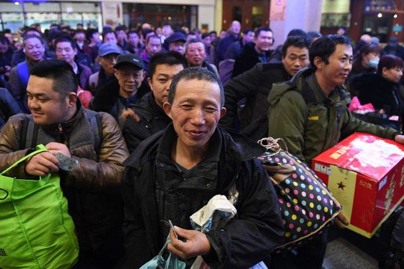 1月9日深夜,在北京火车站,乘坐K4051次列车的夏映生(中)在候车室排队。