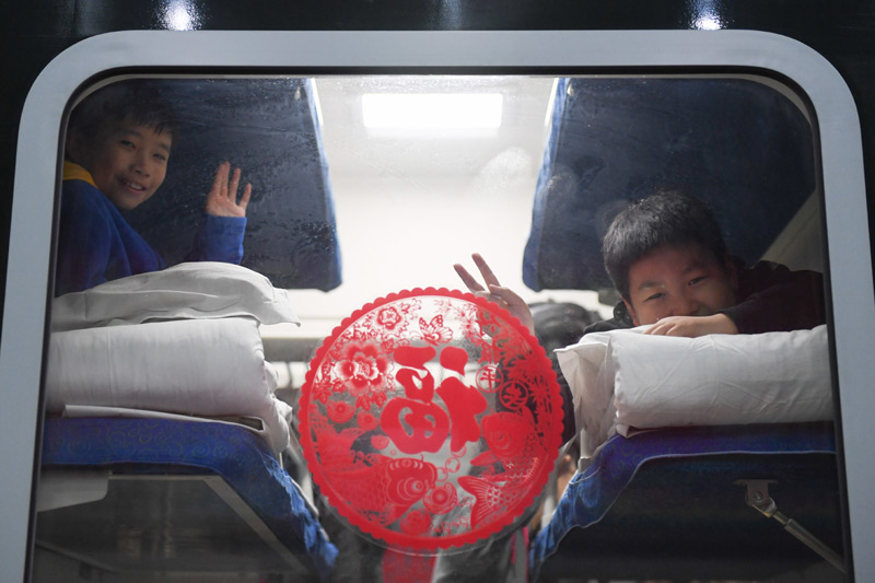 1月10日,在北京火车站,乘坐K4051次列车的小朋友向火车窗外招手。