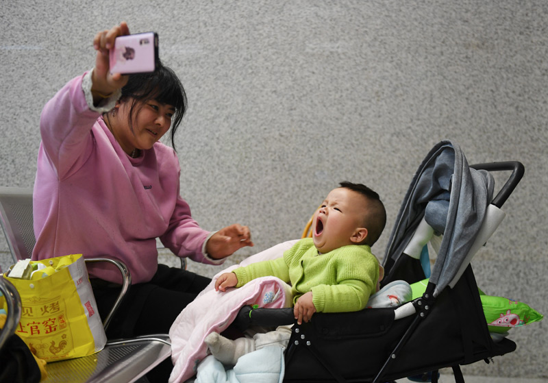 1月10日,在深圳东站候车室,小乘客在看工作人员贴窗花。