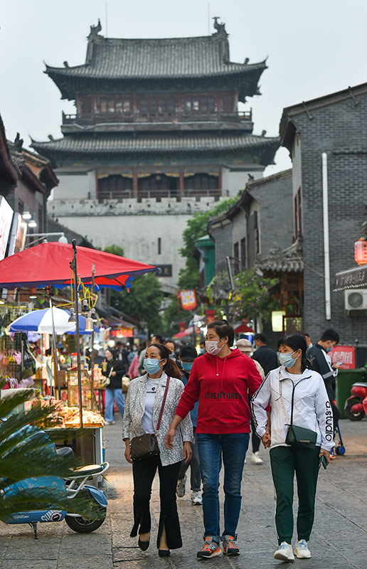5月4日,游客在河南洛阳老城历史文化街区游览。