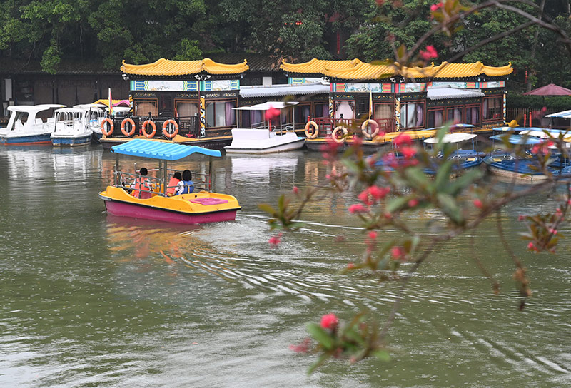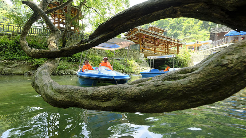 5月5日,在贵州省黔东南苗族侗族自治州天柱县高酿镇春花村泡木冲景区,游客坐船游玩。