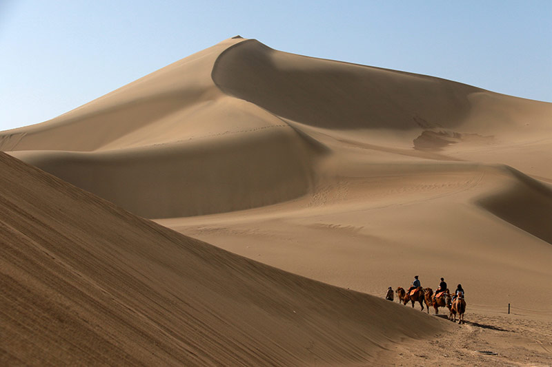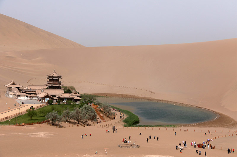5月3日,游客在甘肃省敦煌市鸣沙山月牙泉景区游览。