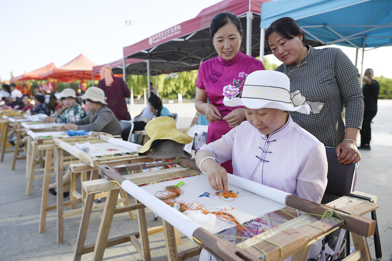 6月23日,民间刺绣艺人在现场展示刺绣技艺。