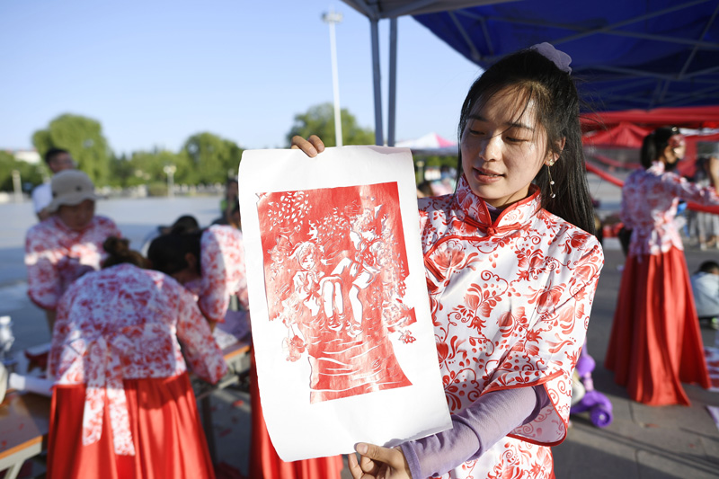 6月23日,一位剪纸参赛者展示自己的剪纸作品。