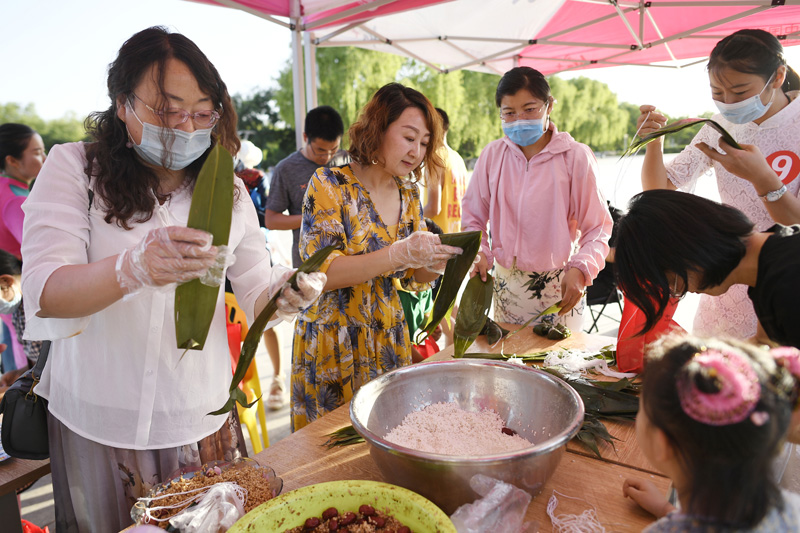6月23日,居民在活动现场参加包粽子比赛。