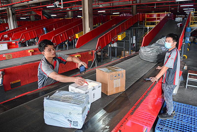 临近“双十一”,位于海口的顺丰速运海口美兰中转场一片繁忙景象。工作人员借助分拣设备,抓紧时间分拣、打包快递,保障快递在“双十一”物流高峰期间正常流转。