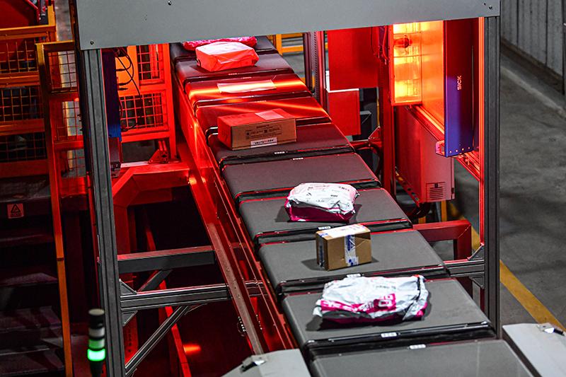 这是11月8日在顺丰速运海口美兰中转场拍摄的分拣设备扫描快递的场景。