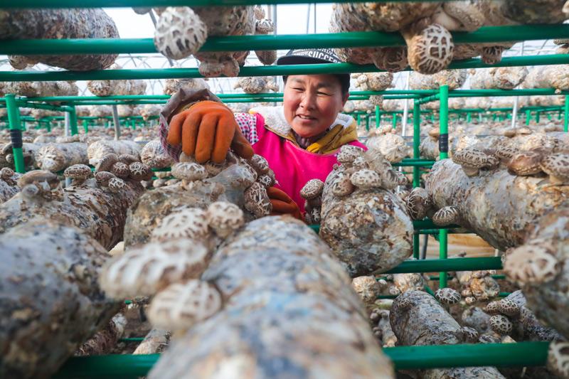1月3日,河南省信阳市光山县十里镇代楼村村民在花菇种植基地收获花菇。