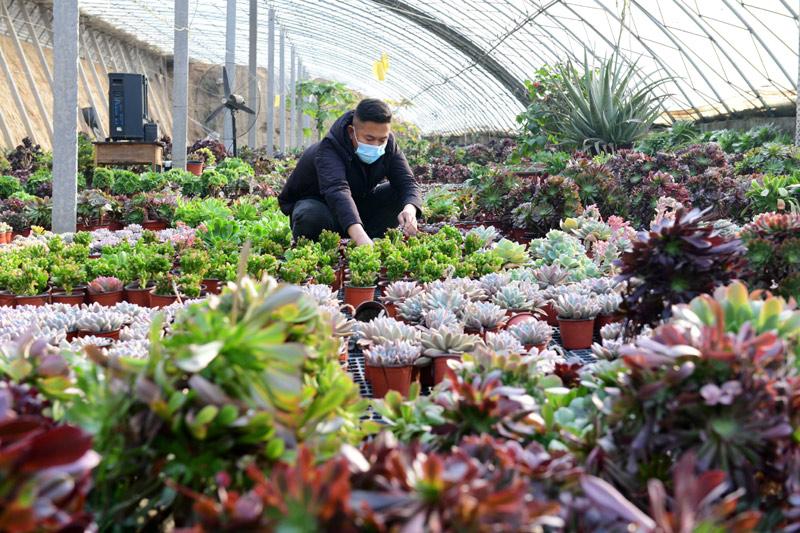 1月4日,花农在河北省石家庄新乐市邯邰镇坚固村大棚内管护多肉植物。