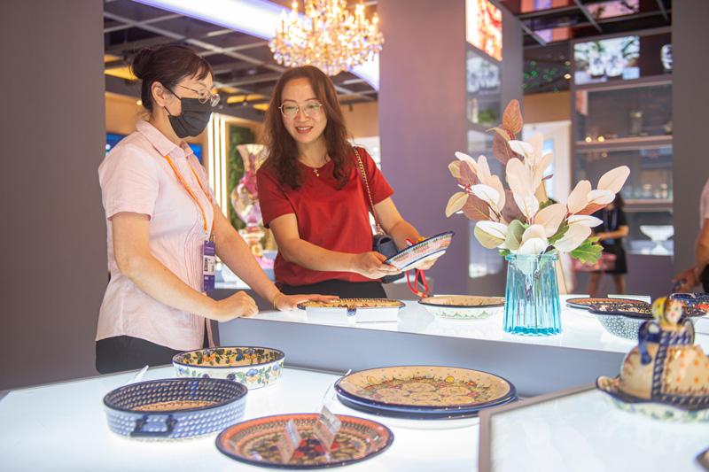 6月8日,参观者(右)在挑选来自波兰的陶瓷工艺品。