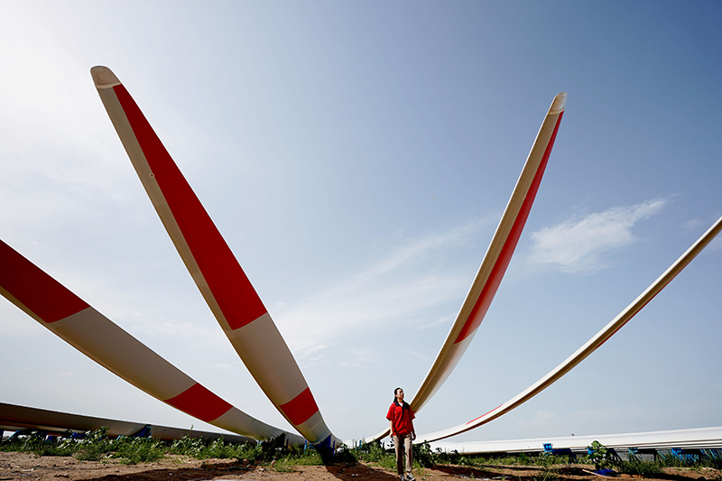6月30日,河北省威县一家风电机组叶片制造企业工人在调试大型风电机组叶片螺孔。