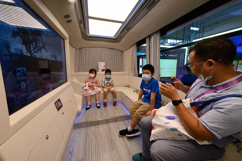 7月7日,在世界人工智能大会体验日,观众在自动驾驶AR小巴内参观。