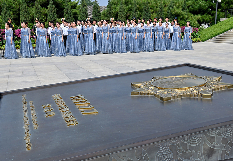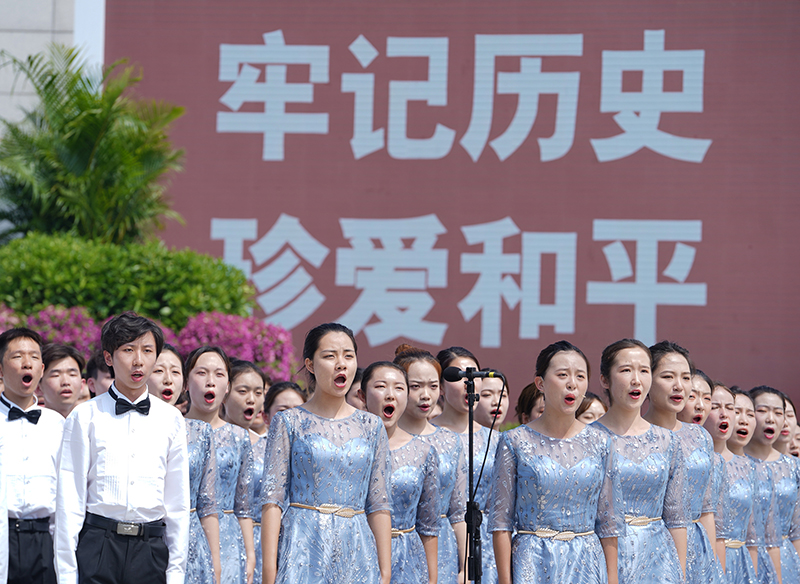 7月7日,首都大学生合唱团在仪式上演唱抗战歌曲。