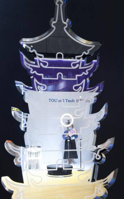 9月23日,参展者在第十七届文博会南京展台展示文创科技产品。
