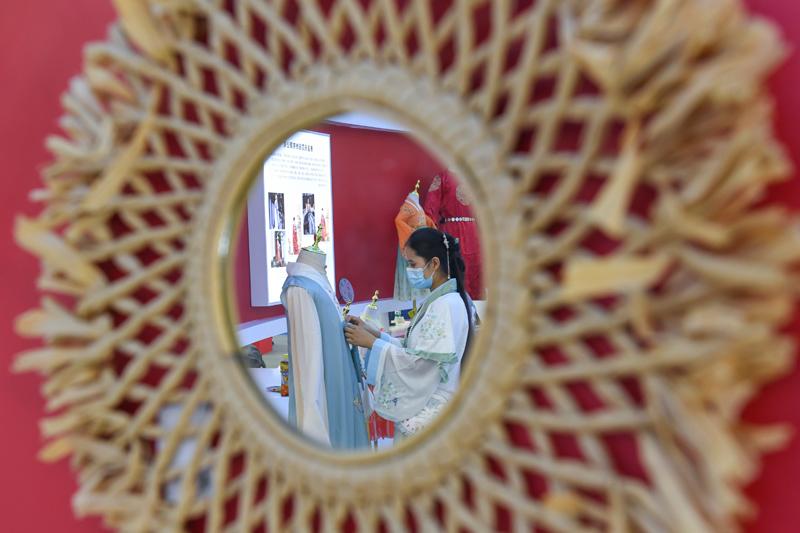 9月23日,在第十七届文博会山东展台,身着汉服的参展人员整理展示的汉服。