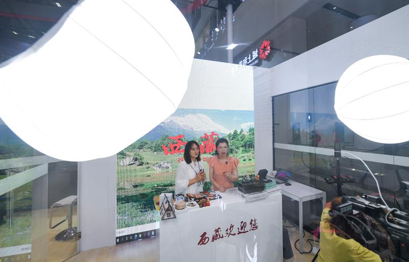 9月23日,参展者在第十七届文博会西藏展台直播。