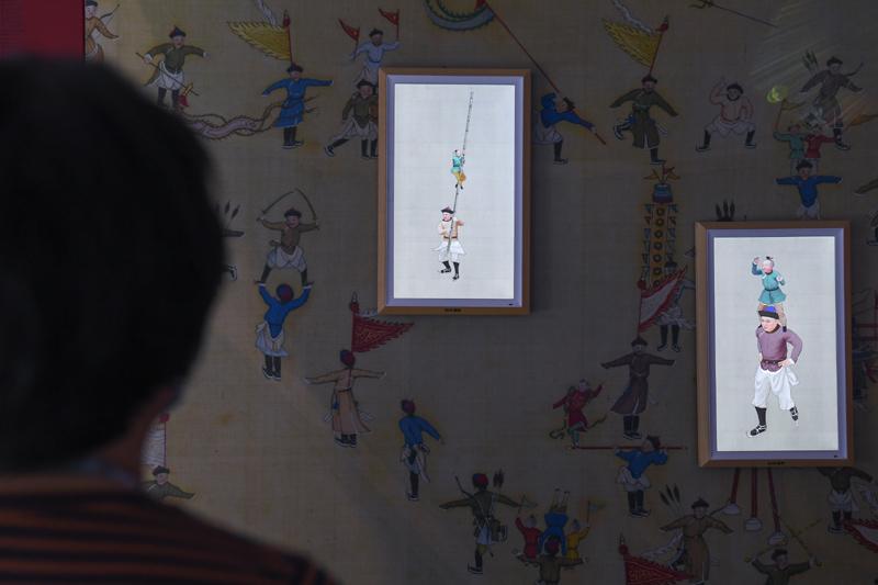 9月23日,观众在第十七届文博会故宫博物院展台欣赏数字化《冰嬉图》局部。