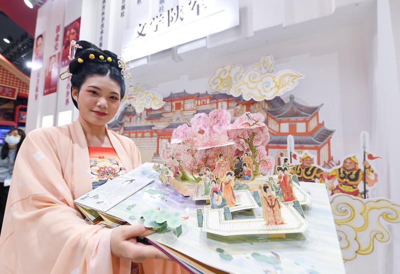 9月23日,盛装的参展者在第十七届文博会陕西展台展示《大唐长安》立体书。